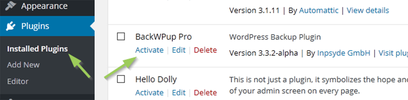 - Proceed installing and activating the new plugin via WordPress. For further support you can also refer to How to install BackWPup Pro and activate your licence