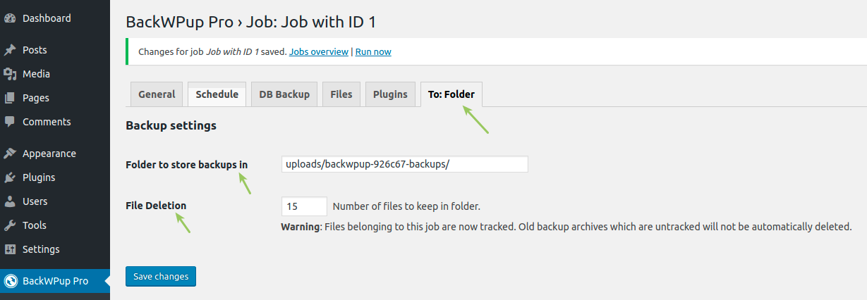- In the Folder to store backups in, enter a name for the folder where the backups will be stored. This folder will be located inside the wp-content folder of your WordPress installation