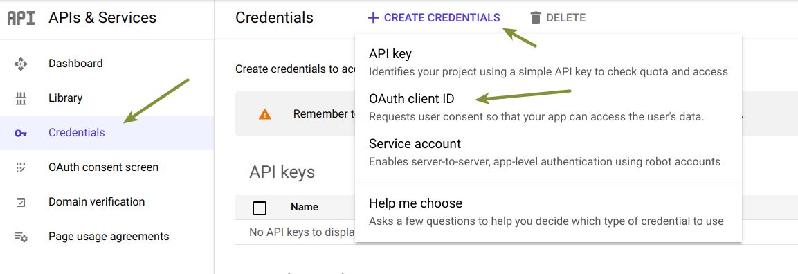 Select the OAuth consent screen link in the left menu and then click on PUBLISH APP - Once the consent screen is set, click on the Credentials link in the main dashboard and then click on the + CREATE LOGIN DATA link and select OAuth Client ID.