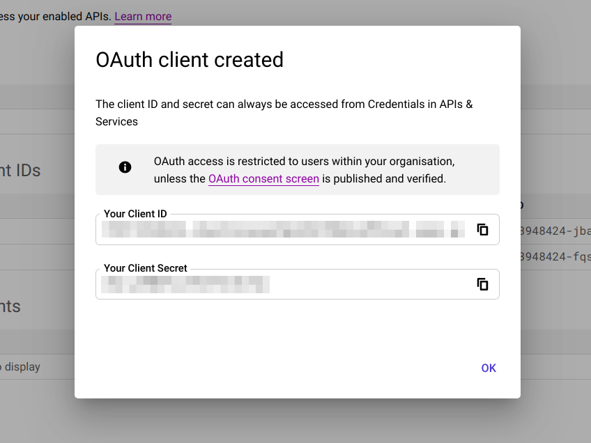 - After that, the client will be created, and you will be shown the client ID and client secret.