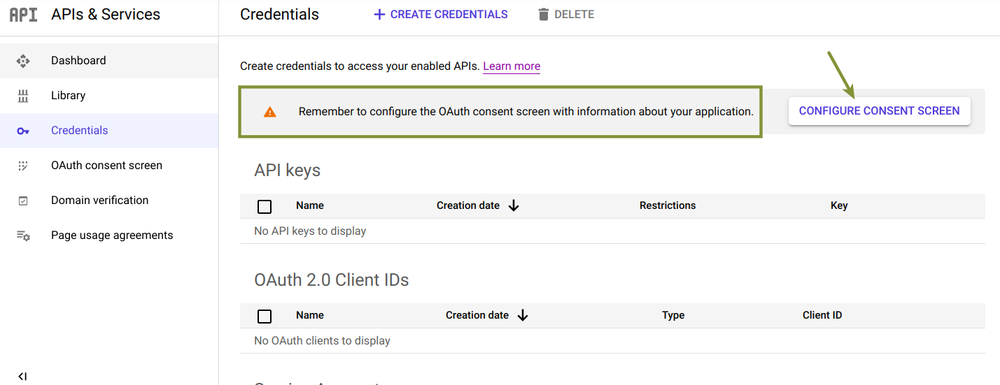 Activate the Google Drive API for this project - Click on Credentials in the sidebar, and if a consent screen configuration is requested because it has not been set before (as in the image below), click CONFIGURE CONSENT SCREEN.