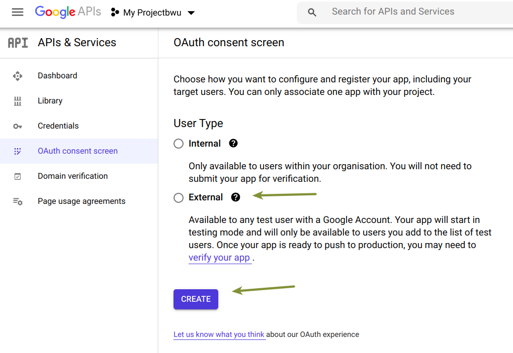 Click on CONFIGURE CONSENT SCREEN if no consent screen is set On the next screen, select the External option: