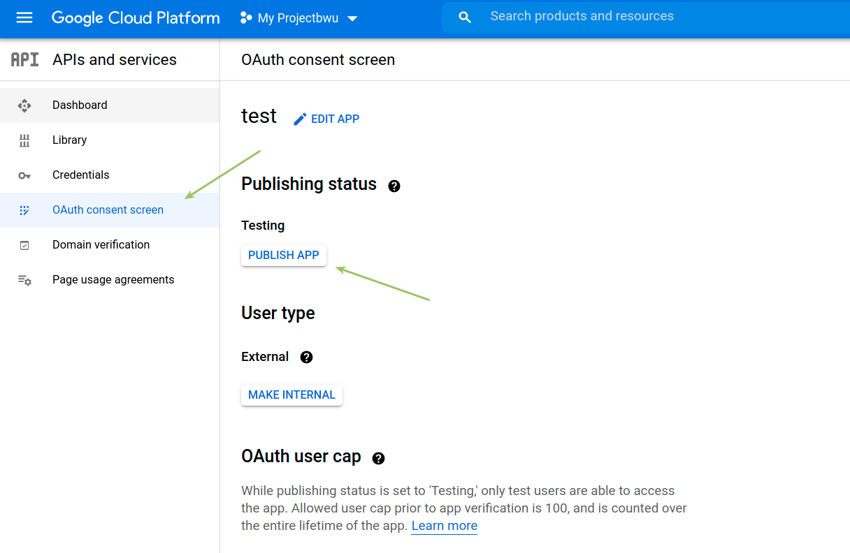 After these settings, authentication is set in test mode by default: To put it to production when you need to use the app in production mode, select the link to the OAuth approval screen in the left menu and click PUBLISH APP.